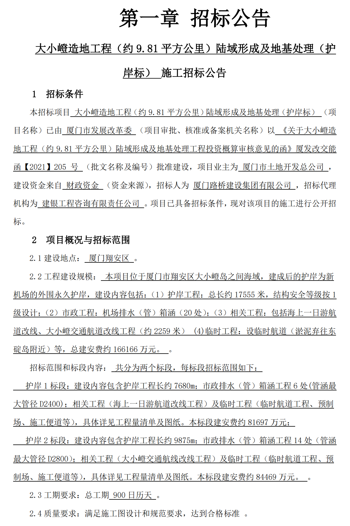 16億大項目!廈門大小嶝造地工程! 發布日期:2021年06月04日 瀏覽次數:4735 關鍵字: 公司 項目基本信息招標項目編號: E3500000717002736002招標人: 廈門路橋建設集團有限公司招標代理名稱: 建銀工程咨詢有限責任公司招標類型: 施工招標方式: 公開招標聯系電話: 13616032431