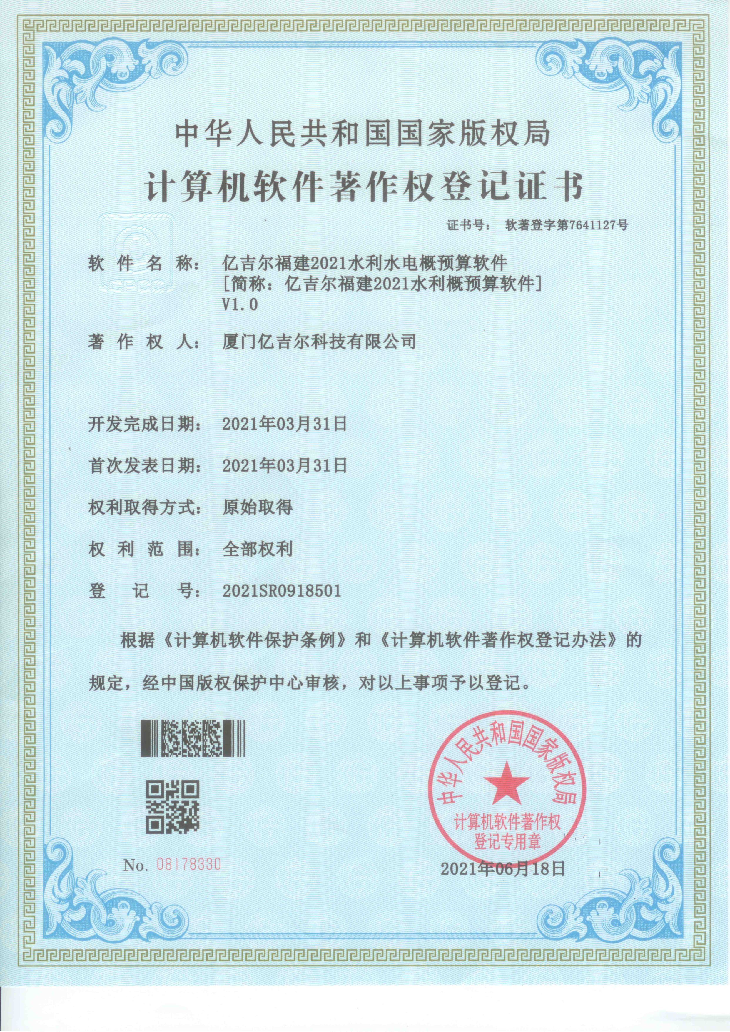 億吉爾福建2021水利水電概預(yù)算軟件著作權(quán)證書 發(fā)布日期:2023年11月22日 瀏覽次數(shù):2764 關(guān)鍵字: 公司 1/1億吉爾福建2021水利水電概預(yù)算軟件著作權(quán)證書