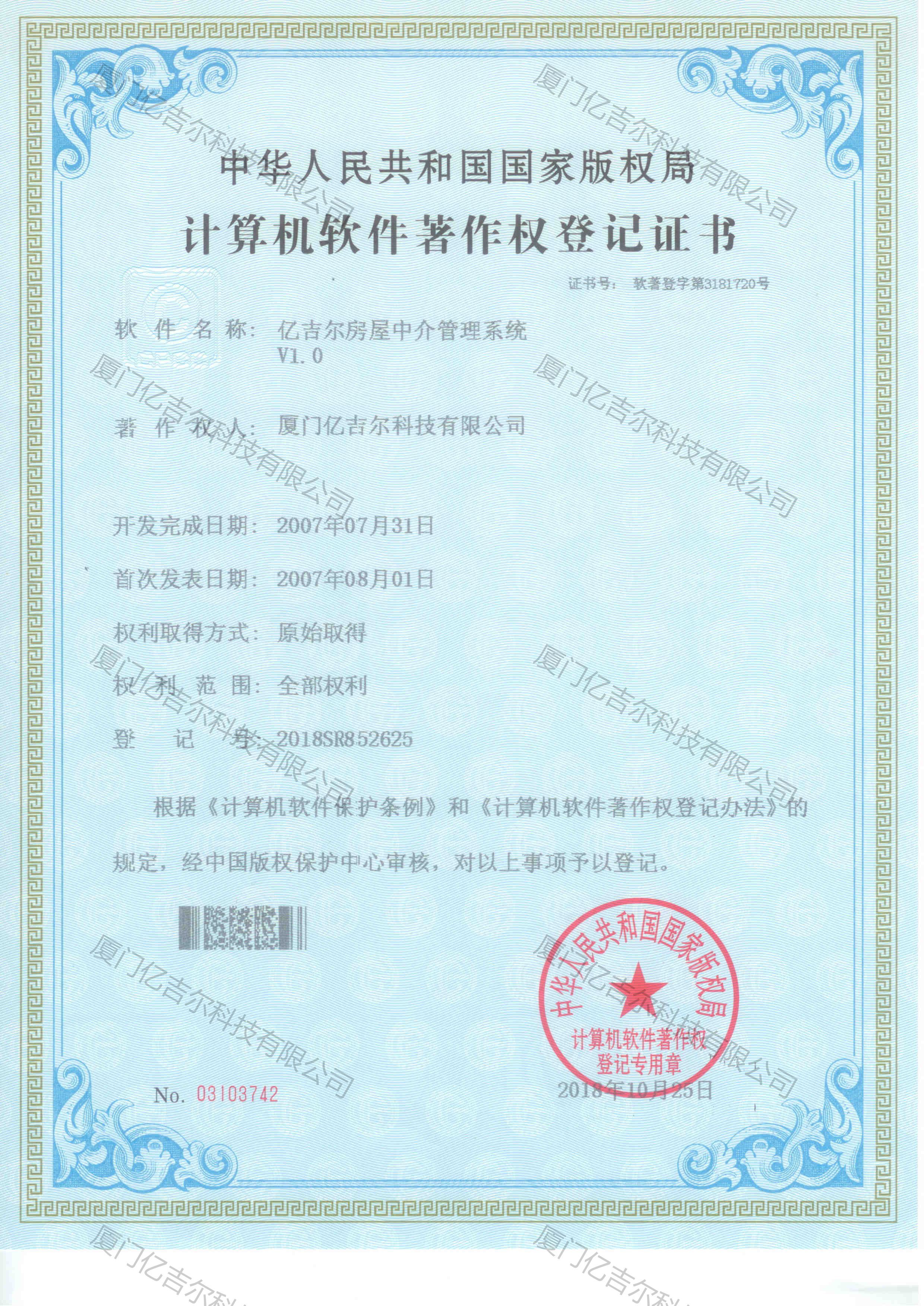 億吉爾房屋中介管理系統(tǒng)軟件著作權(quán)登記證書(shū) 發(fā)布日期:2018年10月25日 瀏覽次數(shù):4473 關(guān)鍵字: 公司 1/1億吉爾房屋中介管理系統(tǒng)軟件著作權(quán)登記證書(shū)
