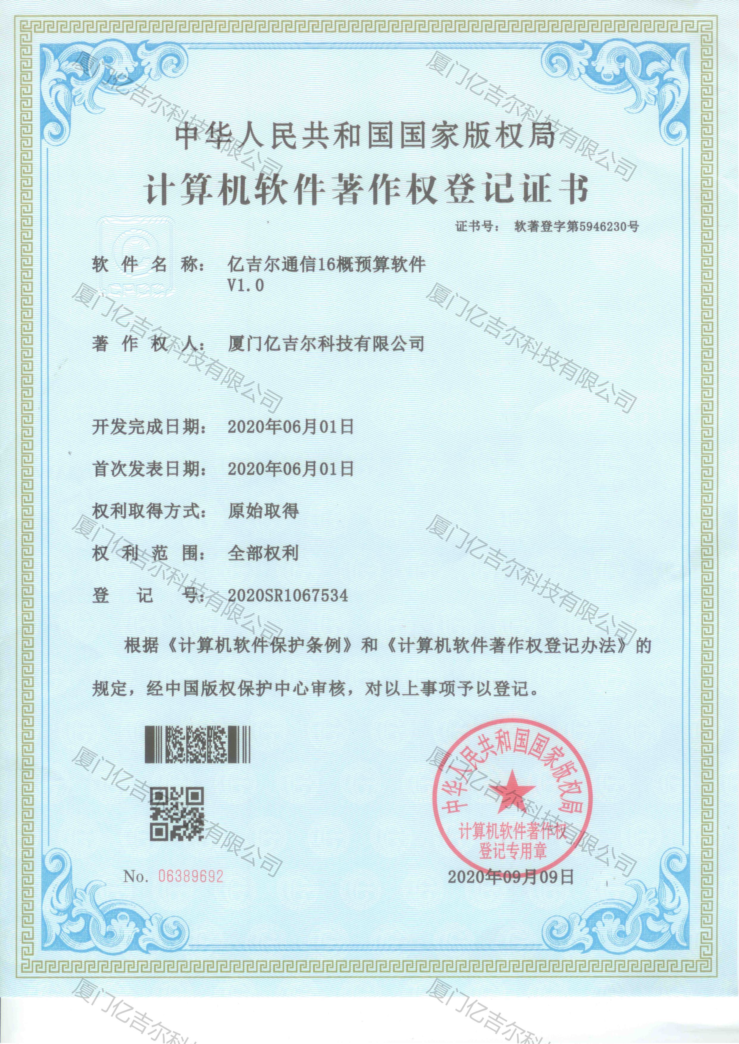 億吉爾通信16概預算軟件著作權(quán)登記證書 發(fā)布日期:2020年09月09日 瀏覽次數(shù):4660 關(guān)鍵字: 公司 1/1億吉爾通信16概預算軟件著作權(quán)登記證書