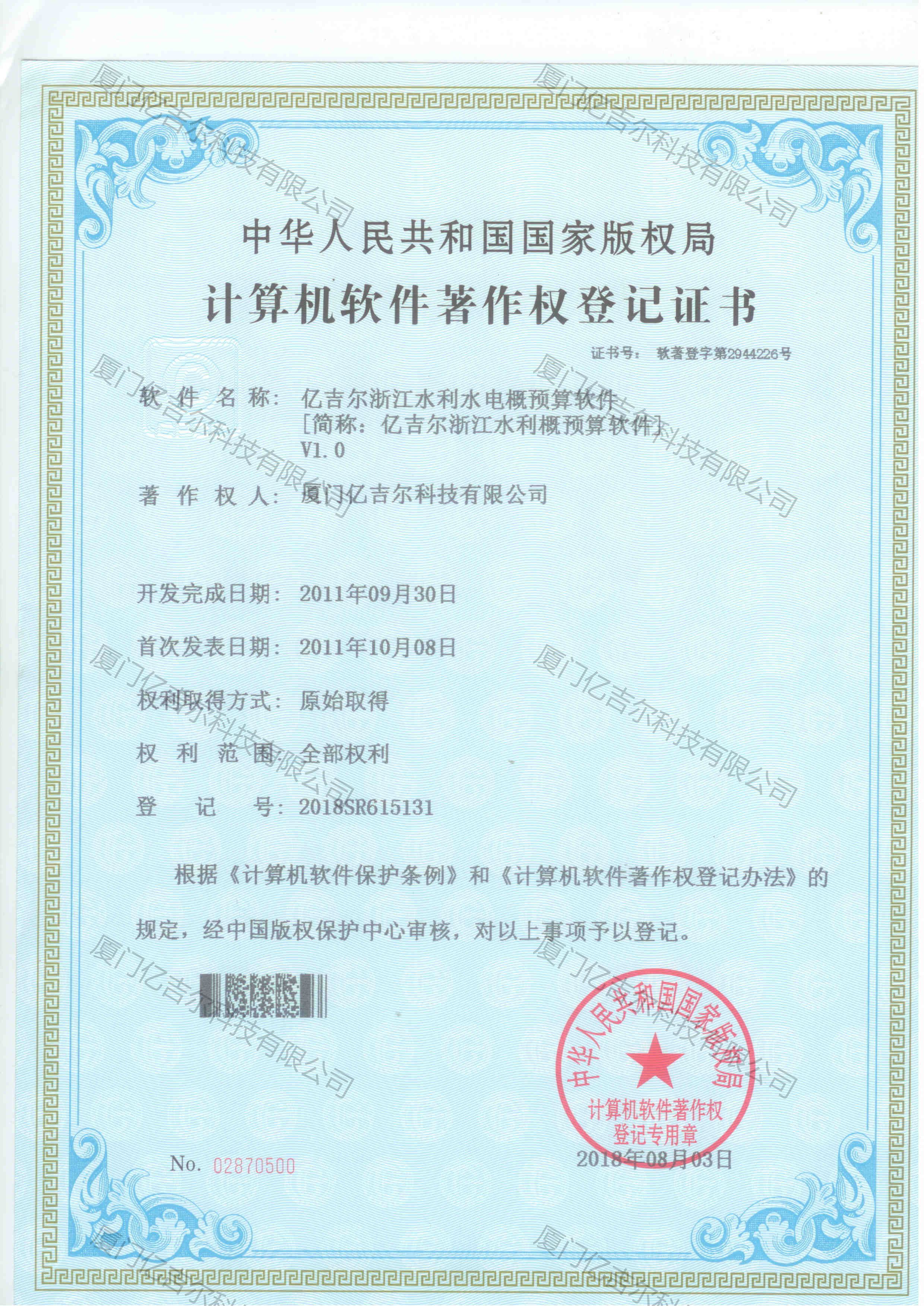 億吉爾浙江水利水電概預(yù)算軟件著作權(quán)登記證書 發(fā)布日期:2018年08月03日 瀏覽次數(shù):4073 關(guān)鍵字: 公司 1/1億吉爾浙江水利水電概預(yù)算軟件著作權(quán)登記證書